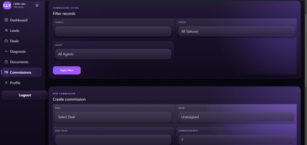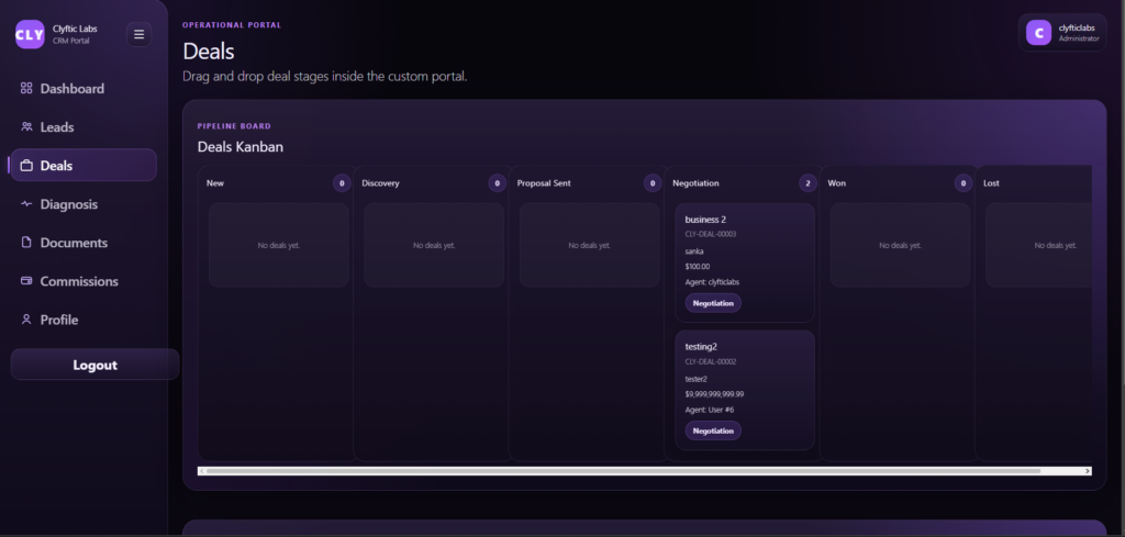 Clyftic CRM Portal is a role-based internal operations platform built to manage lead intake, sales agent workflows, diagnosis stages, deals, commissions, notifications, and visibility across the growth pipeline from one structured environment. Instead of handling sales operations through scattered communication, inconsistent follow-up, and disconnected records, the platform creates a controlled workflow where leads, diagnosis, deal movement, and agent activity can be tracked more clearly and managed more efficiently.